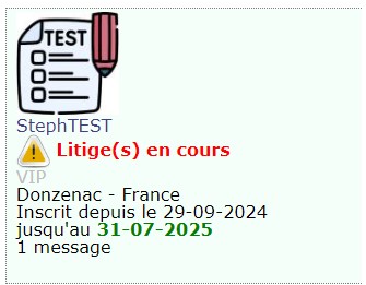 - n'ignorez pas son message, le statut 'Litige(s) en cours' est souvent transitoire, il est régulièrement le fait d'incompréhensions et les équipiers du site oeuvrent pour que des conciliations aient lieu.